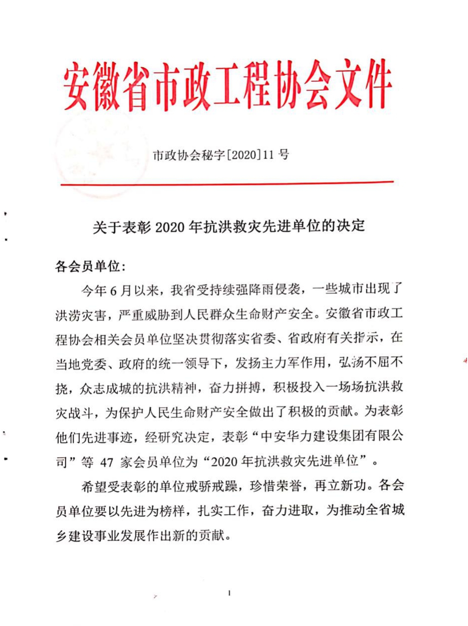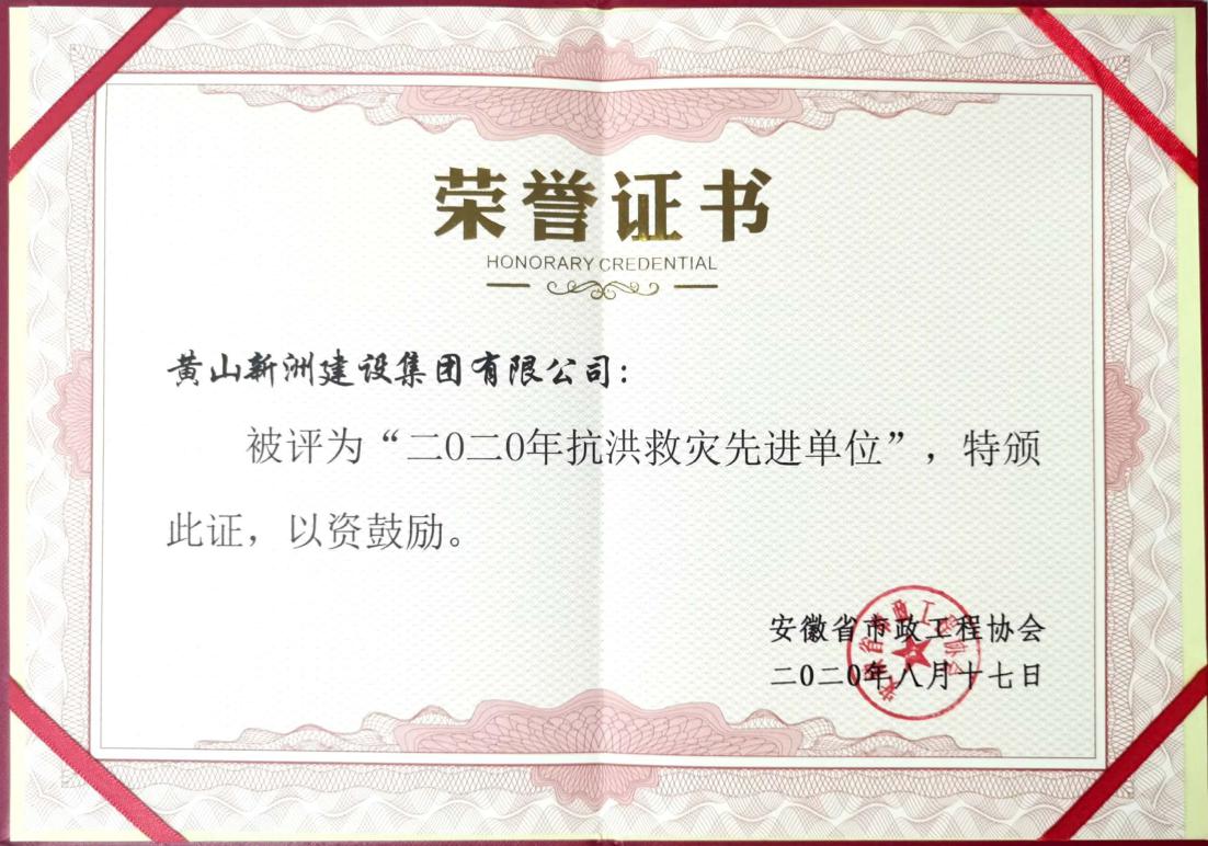 2020年8月17日,黃山新洲建設(shè)集團(tuán)有限公司榮獲“2020年抗洪救災(zāi)先進(jìn)單位”稱號(hào)。