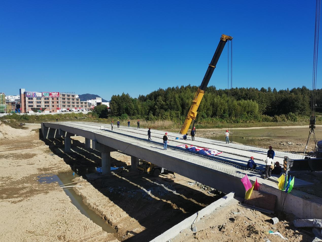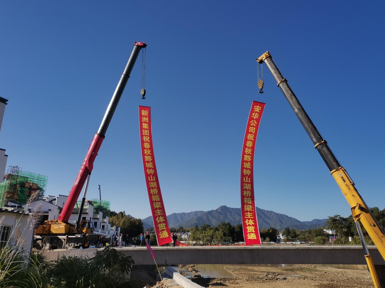 伴隨著最后一片箱梁吊裝到位,春秋黟城鐘山湖橋12片箱梁全部架設(shè)完成。根據(jù)施工組織設(shè)計(jì)的要求,鐘山湖橋采用箱梁現(xiàn)場預(yù)制、輪胎起重機(jī)吊運(yùn)施工。先將預(yù)制好的箱梁經(jīng)運(yùn)梁車運(yùn)送至指定地點(diǎn),通過輪胎起重機(jī)吊運(yùn),經(jīng)過調(diào)節(jié)至設(shè)計(jì)位置,完成架設(shè)。